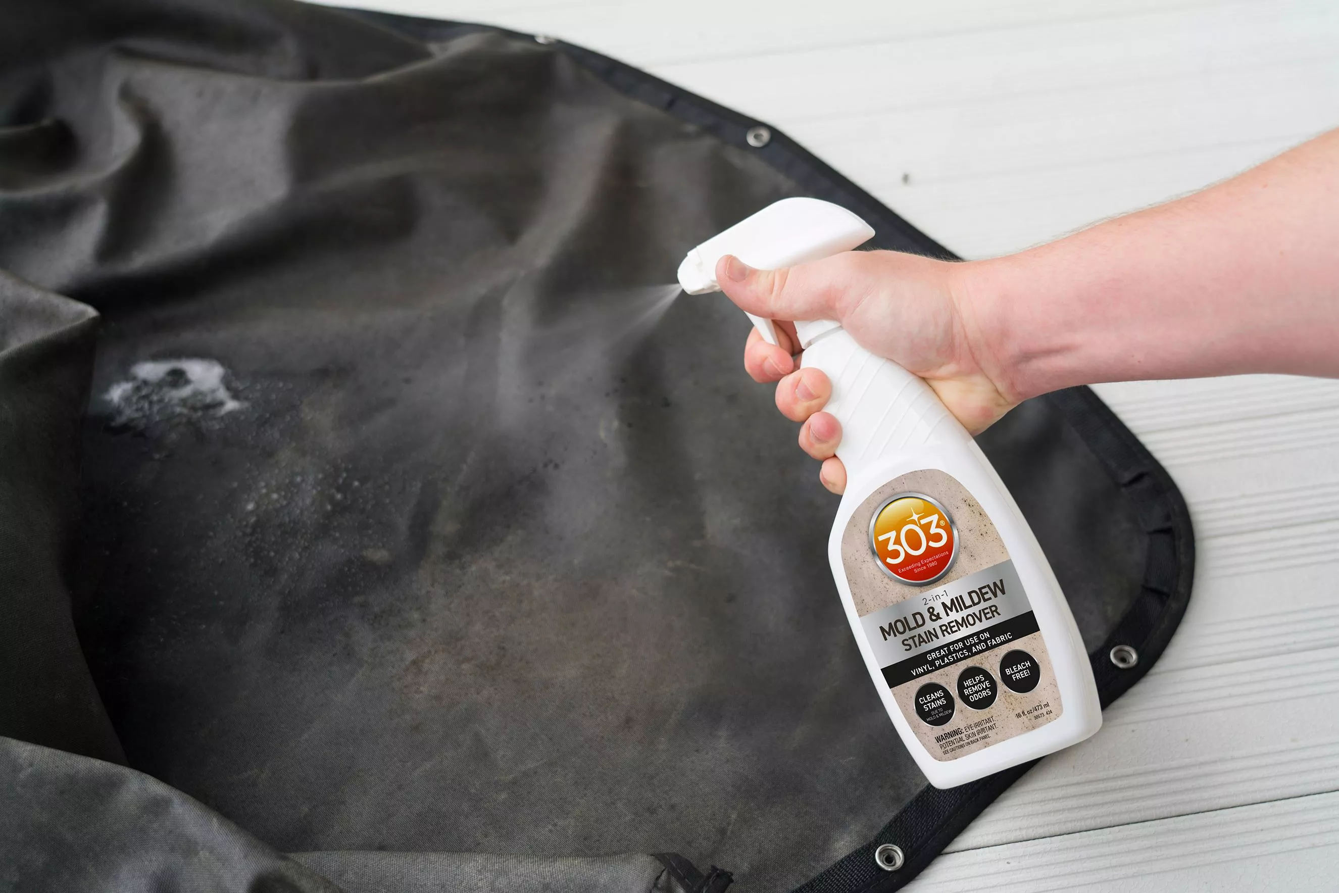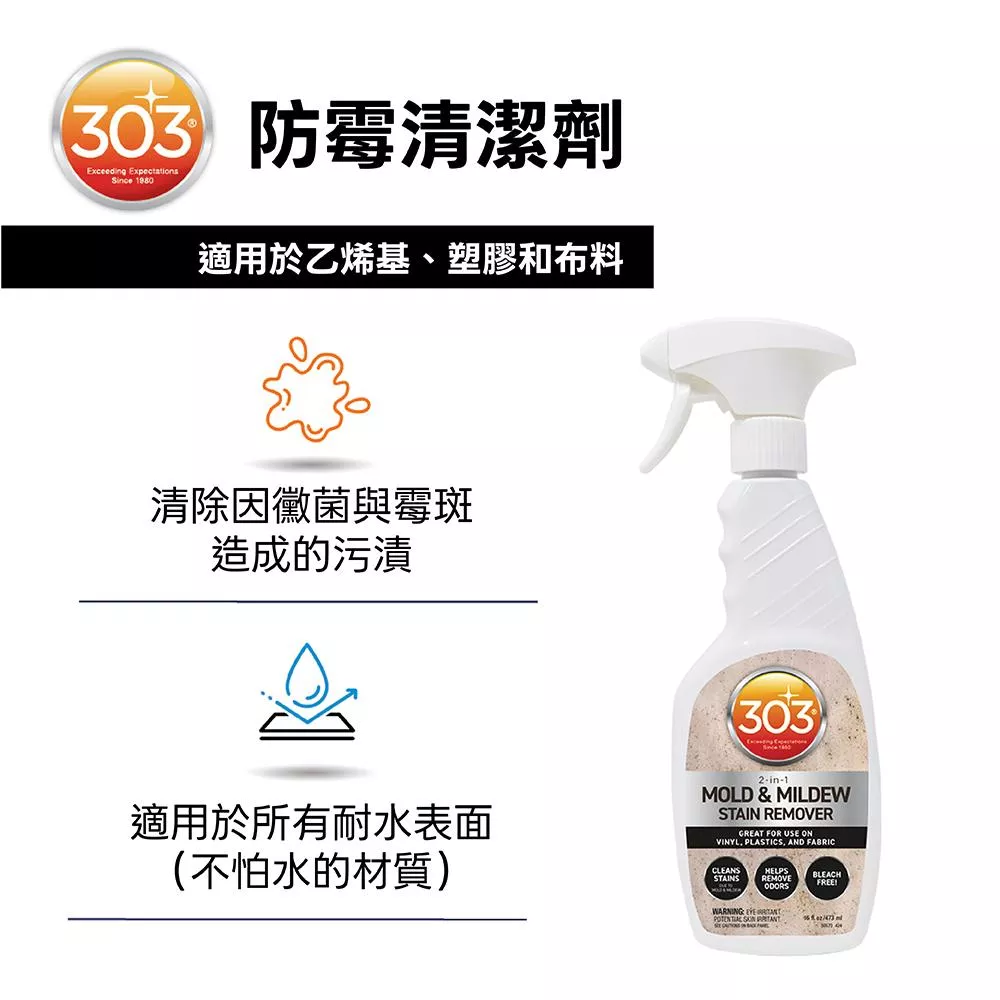 303 Mold & Mildew Stain Remover 是一款專為各種耐水表面設計的高效二合一清潔劑,能迅速清除因黴菌與霉斑造成的深層汙垢。本產品採用不含漂白劑(Bleach-Free)的溫和配方,不僅帶有清新的香氣,更能有效去除難聞的霉味。不論是乙烯基、塑膠還是布料表面,皆能安全使用而不傷材質,是居家、戶外家具及船艇保養的理想選擇。