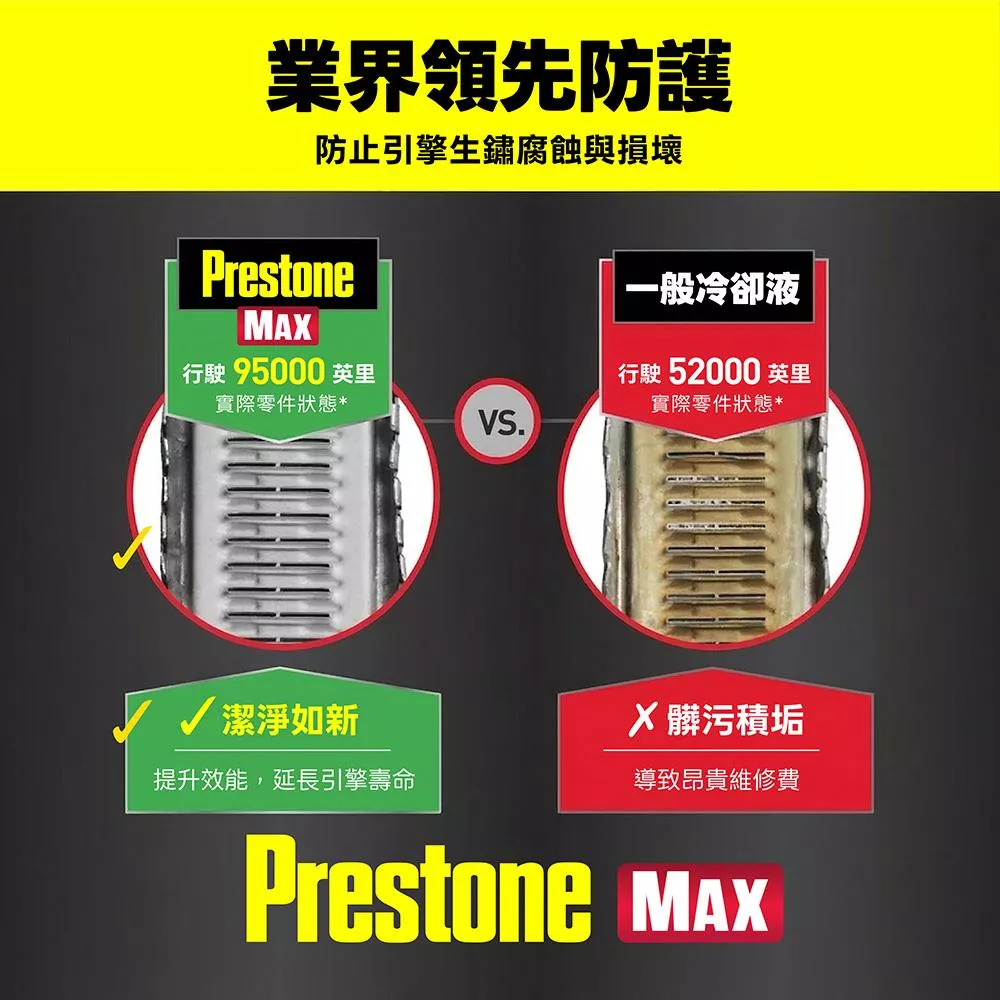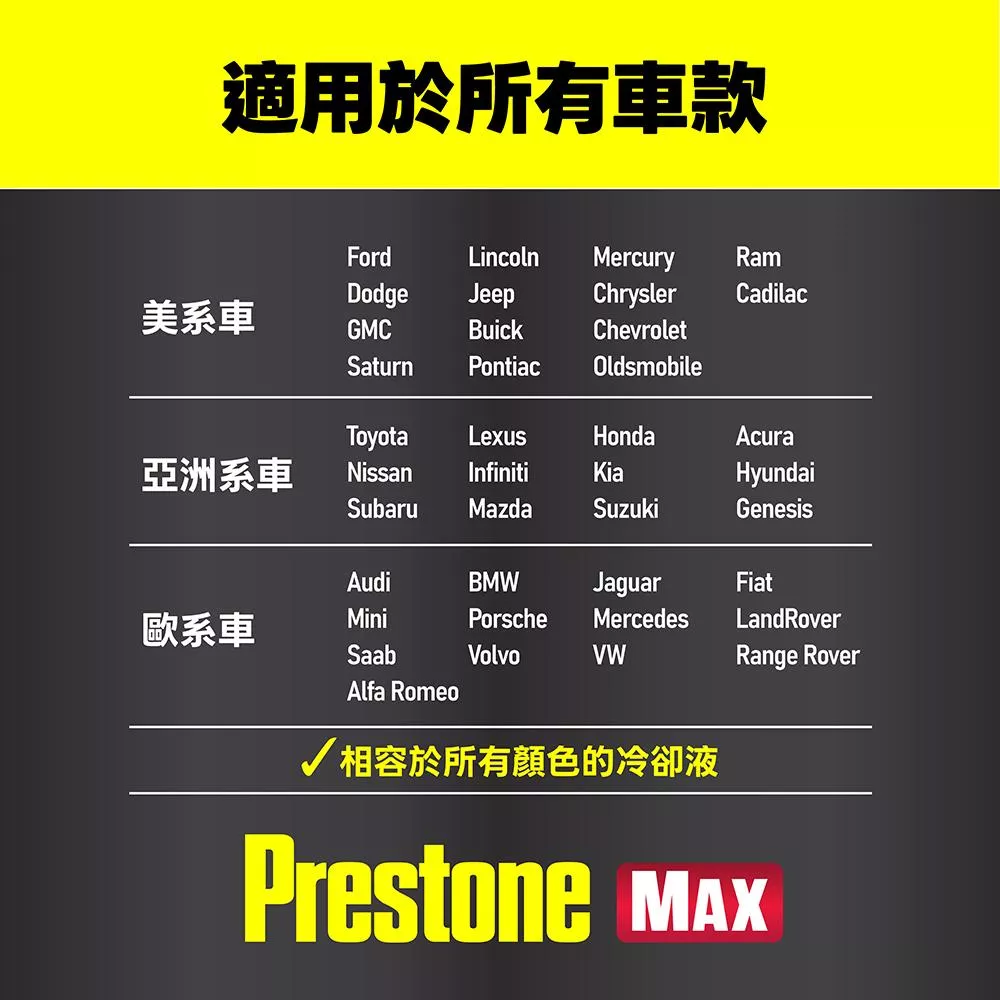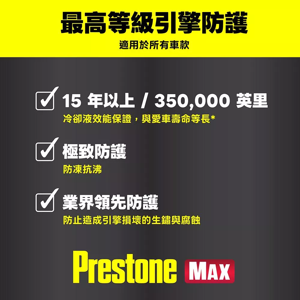 Prestone MAX 是一款革命性的頂級水箱冷卻液。採用百適通最先進的防護技術,提供業界領先的 15年或35萬英里 (約56萬公里)超長效保護力。這款「通用型」配方專為所有廠牌、所有型號的乘用車、輕型卡車設計,並通過了 Hybrid (油電車) 與 EV (電動車) 的嚴苛測試。免稀釋、即開即用,能與任何顏色的冷卻液完美相容,讓您的引擎冷卻系統始終維持在如新車般的潔淨狀態。